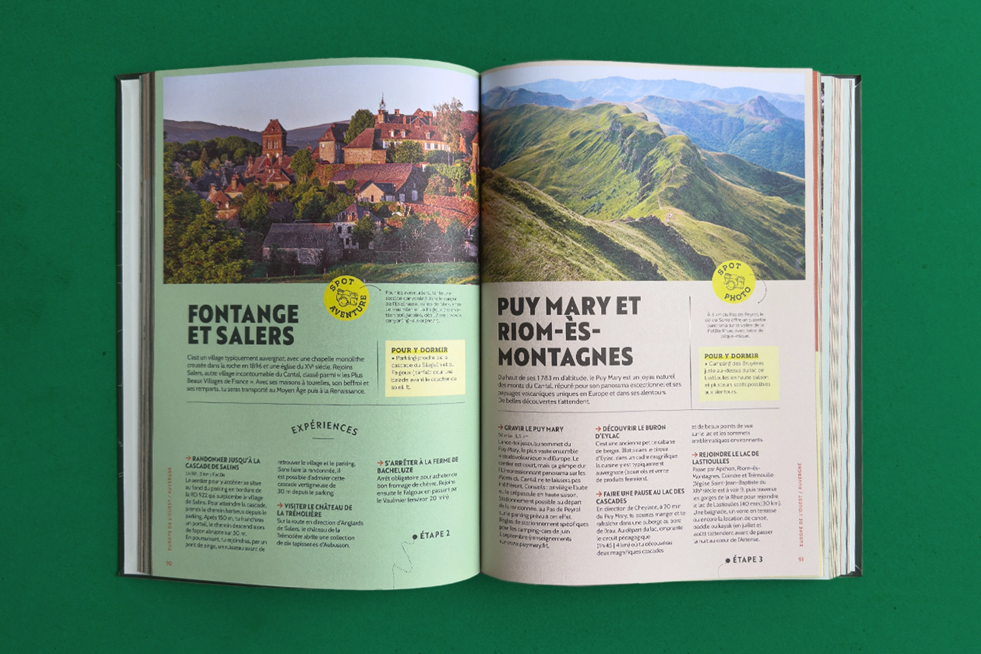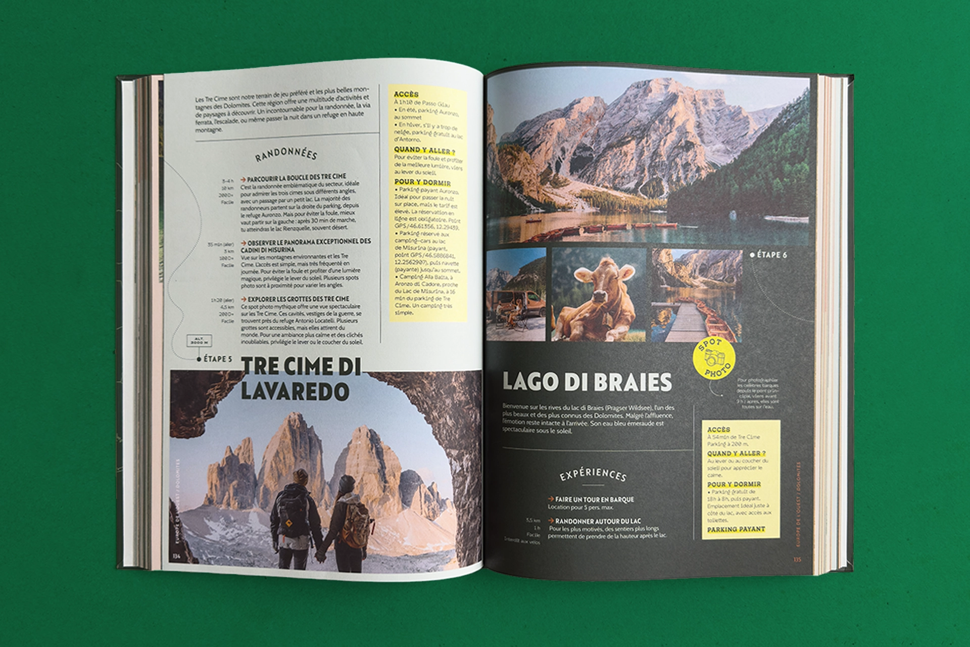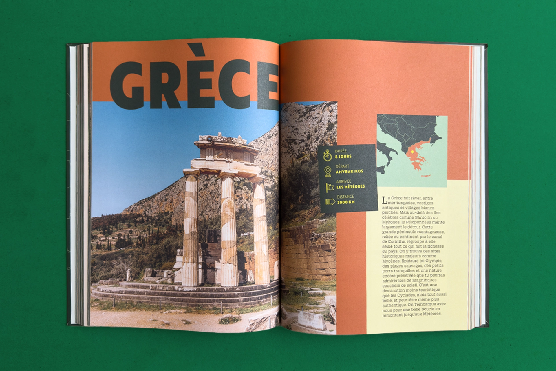 De la couverture aux pages intérieures, nous avons déployé une ambiance « nature & aventure », avec des couleurs directement inspirées des paysages immortalisés par Lilia et Valentin. Des teintes minérales, végétales, solaires, pour faire voyager dès le premier regard.